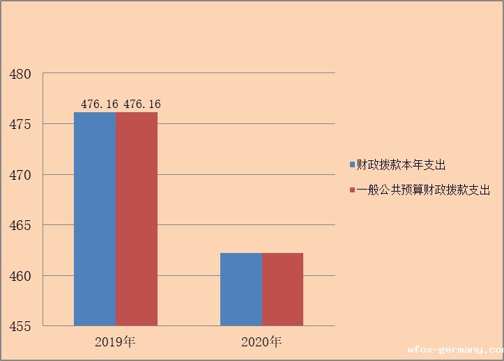 五、一般公共预算财政拨款支出决算情况说明 (一)一般公共预算财政拨款支出决算总体情况 2020年一般公共预算财政拨款支出462.2万元,占本年支出合计的100%。与2019年相比,一般公共预算财政拨款支出减少13.96万元,下降2.93%。主要原因是受新冠疫情影响本年政务工作量下降、进京上访群众数量减少引起项目支出相应下降。 图5:一般公共预算财政拨款支出决算变动情况(单位:万元)