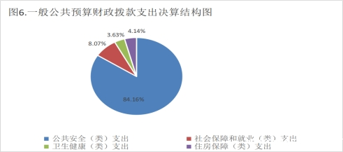 (二)一般公共预算财政拨款支出决算结构情况 2020年一般公共预算财政拨款支出4388.96万元,主要用于以下方面:公共安全支出(类)支出3693.59万元,占84.16%;社会保障和就业(类)支出353.99万元,占8.07%;卫生健康支出159.31万元,占3.63%;住房保障支出182.07万元,占4.14%。