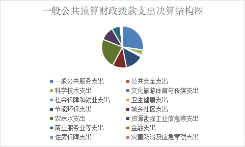 (二)一般公共预算财政拨款支出决算结构情况 2021年一般公共预算财政拨款支出17,544.14万元,主要用于以下方面:一般公共服务(类)支出4,791.15万元,占27%;节能环保支出支出2,465.00万元,占14%;城乡社区支出705.00万元,占11%;农林水支出4,065.70万元,占23%;文化旅游体育与传媒(类)支出8.20万元,占0%;社会保障和就业(类)支出184.14万元,占1%;卫生健康支出54.91万元,占0%;住房保障支出143.57万元,占1%;商业服务业等支出1,119.71万元,占6%;资源勘探工业信息等支出1,879.00万元,占11%;灾害防治及应急管理支出138.69万元,占1%。