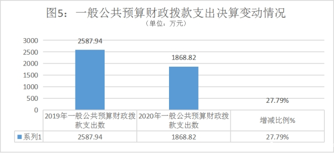 五、一般公共预算财政拨款支出决算情况说明 (一)一般公共预算财政拨款支出决算总体情况 2020年一般公共预算财政拨款支出1868.82万元,占本年支出合计的90.11%。与2019年相比,一般公共预算财政拨款减少719.12万元,下降27.79%。主要变动原因是2020年新冠肺炎疫情发生,相关对外宣传活动和项目未开展,支出减少。