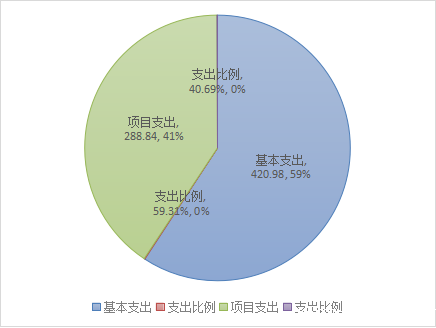 二、 收入决算情况说明 2020年本年收入合计705.24万元,其中:一般公 共预算财政拨款收入700.37万元,占99.31%;政府性基金预算财政拨款收入0万元,占0%;上级补助收入0万元,占0%;事业收入0万元,占0%;经营收入0万元,占0%;附属单位上缴收入0万元,占0%;其他收入4.87万元,占0.69%。 (注:数据来源于财决公开01表) (图2:收入决算结构图)(饼状图) 三、 支出决算情况说明 2020年本年支出合计709.80万元,其中:基本支出420.98万元,占59.31%;项目支出288.84万元,占40.69%;上缴上级支出0万元,占0%;经营支出0万元,占0%;对附属单位补助支出0万元,占0%。 (注:数据来源于财决公开03表) (图3:支出决算结构图)(饼状图)