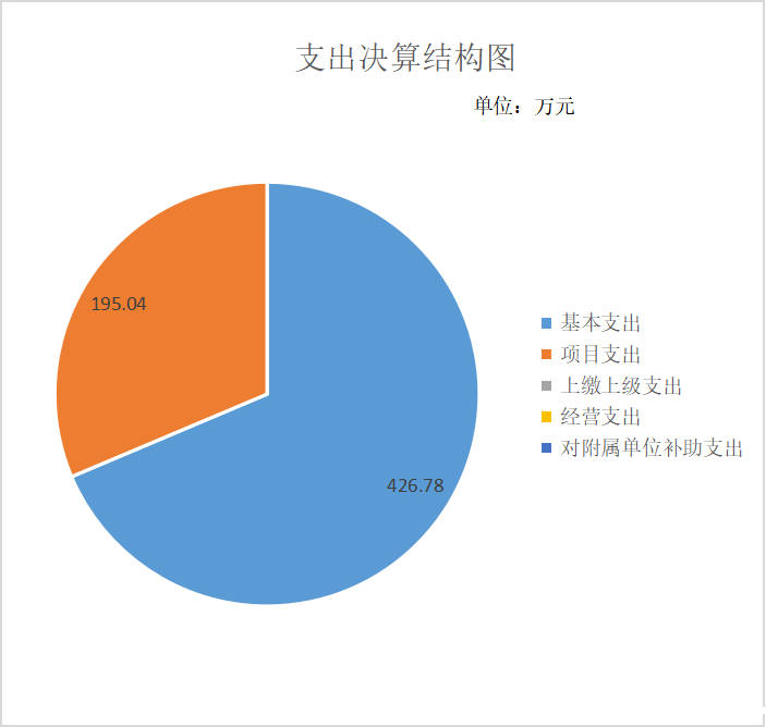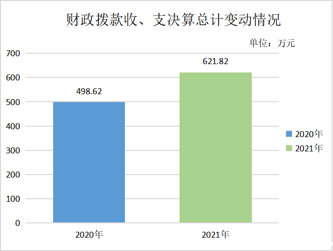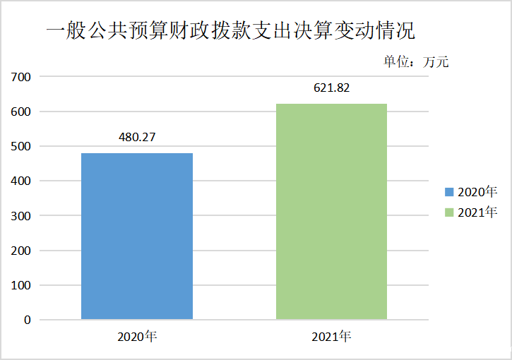 2021年本年收入合计621.82万元,其中:一般公共预算财政拨款收入621.82万元,占100%;政府性基金预算财政拨款收入0万元,占0%;国有资本经营预算财政拨款收入0万元,占0%;上级补助收入0万元,占0%;事业收入0万元,占0%;经营收入0万元,占0%;附属单位上缴收入0万元,占0%;其他收入0万元,占0%。 (图2:收入决算结构图)(饼状图) 2021年本年支出合计621.82万元,其中:基本支出426.78万元,占68.63%;项目支出195.04万元,占31.37%;上缴上级支出0万元,占0%;经营支出0万元,占0%;对附属单位补助支出0万元,占0%。 (图3:支出决算结构图)(饼状图) 2021年财政拨款收、支总计621.82万元。与2020年相比,财政拨款收、支总计各增加123.2万元,增长24.71%。主要变动原因是人员增加及工作项目增多,支出增多。 (图4:财政拨款收、支决算总计变动情况)(柱状图) 2021年一般公共预算财政拨款支出621.82万元,占本年支出合计的100%。与2020年相比,一般公共预算财政拨款支出增加123.2万元,增长24.71%。主要变动原因是人员增加及工作项目增多,支出增多。 (图5:一般公共预算财政拨款支出决算变动情况)(柱状图) 2021年一般公共预算财政拨款支出621.82万元,主要用于以下方面:一般公共服务(类)支出539.61万元,占86.78%;社会保障和就业(类)支出41.72万元,占6.71%;卫生健康支出19.18万元,占3.08%;住房保障支出21.31万元,占3.43%;。 (图6:一般公共预算财政拨款支出决算结构)(饼状图) 2021年一般公共预算支出决算数为621.82,完成预算100%。其中: 1.一般公共服务(类)政府办公厅(室)及相关机构事务(款)行政运行(项):支出决算为207.56万元,完成预算100%,决算数等于预算数。 2.一般公共服务(类)政府办公厅(室)及相关机构事务(款)一般行政管理事务(项):支出决算为155.04万元,完成预算100%,决算数等于预算数。 3.一般公共服务(类)政府办公厅(室)及相关机构事务(款)事业运行(项):支出决算为137.02万元,完成预算100%,决算数等于预算数。 4.一般公共服务(类)政府办公厅(室)及相关机构事务(款)其他政府办公厅(室)及相关机构事务支出(项):支出决算为40万元,完成预算100%,决算数等于预算数。 5.社会保障和就业(类)行政事业单位养老支出(款)机关事业单位基本养老保险缴费支出(项):支出决算为28.41万元,完成预算100%,决算数等于预算数。 6.社会保障和就业(类)行政事业单位养老支出(款)机关事业单位职业年金缴费支出(项):支出决算为13.3万元,完成预算100%,决算数等于预算数。 7.卫生健康(类)行政事业单位医疗(款)行政单位医疗(项):支出决算为8.02万元,完成预算100%,决算数等于预算数。 8.卫生健康(类)行政事业单位医疗(款)事业单位医疗(项):支出决算为11.16万元,完成预算100%,决算数等于预算数。 9.住房保障支出(类)住房改革支出(款)住房公积金(项):支出决算为21.31万元,完成预算100%,决算数等于预算数。 2021年一般公共预算财政拨款基本支出426.78万元,其中: 人员经费359.02万元,主要包括:基本工资、津贴补贴、奖金、伙食补助费、绩效工资、机关事业单位基本养老保险缴费、职业年金缴费、职工基本医疗保险缴费、其他社会保障缴费、住房公积金、其他工资福利支出等。 公用经费67.76万元,主要包括:办公费、印刷费、邮电费、差旅费、培训费、公务接待费、工会经费、福利费、其他交通费用、其他商品和服务支出等。 2021年“三公”经费财政拨款支出决算为0.87万元,完成预算34.8%,决算数小于预算数的主要原因是受疫情因素影响,考察调研接待减少,公务接待支出减少。 2021年“三公”经费财政拨款支出决算中,因公出国(境)费支出决算0万元,占0%;公务用车购置及运行维护费支出决算0万元,占0%;公务接待费支出决算0.87万元,占100%。具体情况如下: (图7:“三公”经费财政拨款支出结构)(饼状图) 1.因公出国(境)经费支出0万元,完成预算0%。全年安排因公出国(境)团组0次,出国(境)0人。因公出国(境)支出决算与2020年一致。 2.公务用车购置及运行维护费支出0万元,完成预算0%。公务用车购置及运行维护费支出决算与2020年一致。 其中:公务用车购置支出0万元。全年按规定更新购置公务用车0辆,其中:轿车0辆、金额0万元,越野车0辆、金额0万元,载客汽车0辆、金额0万元。截至2021年12月底,单位共有公务用车0辆,其中:轿车0辆、越野车0辆、载客汽车0辆。 公务用车运行维护费支出0万元。 3.公务接待费支出0.87万元,完成预算34.8%。公务接待费支出决算比2020年增加0.76万元,增长690.91%。主要原因是市州来眉学习考察增多。其中: 国内公务接待支出0.87万元,主要用接待市州来眉考察调研开展业务活动开支的会议费、用餐费等。国内公务接待5批次,67人次(不包括陪同人员),共计支出0.87万元,具体内容包括:南充市来眉考察接待费0.21万元,省证监局考察会议费及接待费0.394万元,巴中市金融工作局调研接待费0.06万元,省地方金融监管局纪检督察组接待费0.06万元,省地方金融监管局纪检督察组接待费0.15万元。 外事接待支出0万元,外事接待0批次,0人,共计支出0万元。 2021年政府性基金预算财政拨款支出0万元。 2021年国有资本经营预算财政拨款支出0万元。 2021年,雷竞技raybet官网入口最金融工作局机关运行经费支出67.76万元,比2020年增加19.64万元,增长40.81%,主要原因是人员增加,办公费增加。 2021年,雷竞技raybet官网入口最金融工作局政府采购支出总额5.03万元,其中:政府采购货物支出5.03万元、政府
