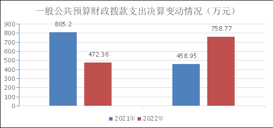 (图4:财政拨款收、支决算总计变动情况) 2022年一般公共预算财政拨款支出758.77万元,占本年支出合计的85.22%。与2021年相比,一般公共预算财政拨款支出减少46.43万元,下降5.77%。主要变动原因是预算级次调整。