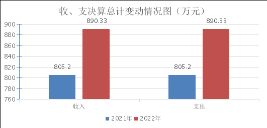 (图1:收、支决算总计变动情况图) 2022年本年收入合计890.33万元,其中:一般公共预算财政拨款收入758.77万元,占85.22%;其他收入131.55万元,占14.78%。