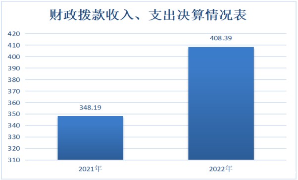 2022年财政拨款收、支总计408.39万元。与2021年相比,财政拨款收、支总计各增加60.2万元,增长17.3%。主要变动原因是单位绩效工资补发及补发调整。