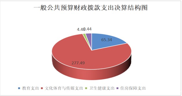 (二)一般公共预算财政拨款支出决算结构情况。 2022年一般公共预算财政拨款支出368.42万元,主要用于以下方面: 教育支出65.34万元,占17.7%;文化体育与传媒支出277.49万元,占75.3%;社会保障和就业支出11.69万元,占3.2%;卫生健康支出4.46万元,占1.2%;住房保障支出9.44万元,占2.6%。
