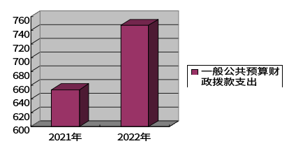 五、一般公共预算财政拨款支出决算情况说明 (一)一般公共预算财政拨款支出决算总体情况。 2022年一般公共预算财政拨款支出747.48万元,占本年支出合计的100%。与2021年相比,一般公共预算财政拨款支出增加93.64万元,增长14.3%。主要变动原因是2022年公务员、事业人员工资和职务正常晋升以及原公务用车车辆已报废,经申请新购买1辆应急保障用车。 (图5:一般公共预算财政拨款支出决算变动情况)(柱状图)
