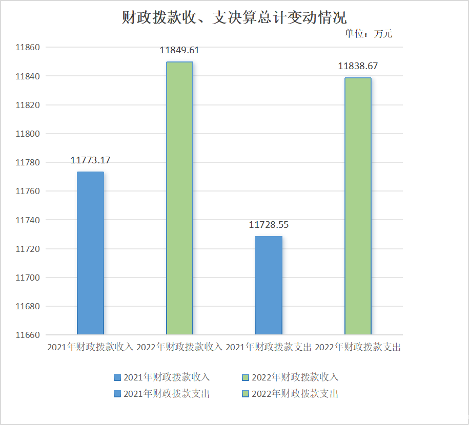 2022年财政拨款收入总计11,849.61万元。与2021年11773.17万元相比,财政拨款收入总计各增加76.44万元,增长0.6%;。2022年财政拨款支出总计11838.67万元。与2021年11728.55万元相比,财政拨款支出总计各增加110.12万元,增长0.94%;主要变动原因是本单位项目安排支出减少。。