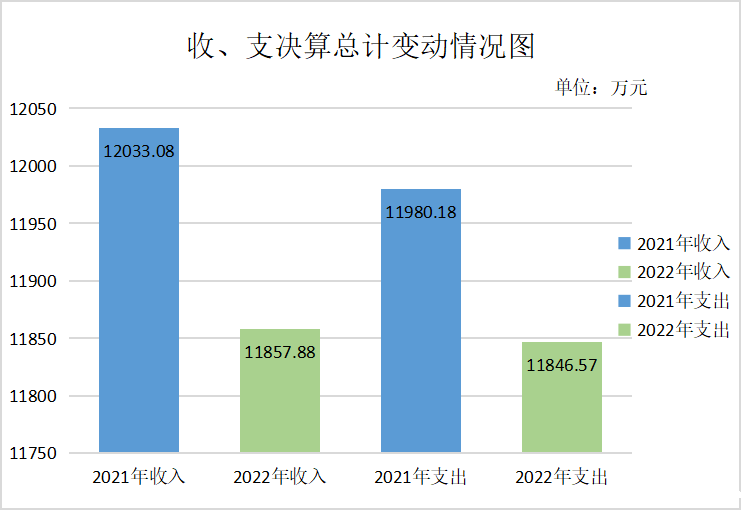 2022年度收入总计11,857.88万元,与2021年收入12033.08万元相比,收入总计减少175.2万元,下降1.5%;2022年度支出总计11,846.57万元,与2021年支出11980.18万元相比,支出总计减少133.61万元,下降1.12%;主要变动原因是本单位项目安排支出减少。