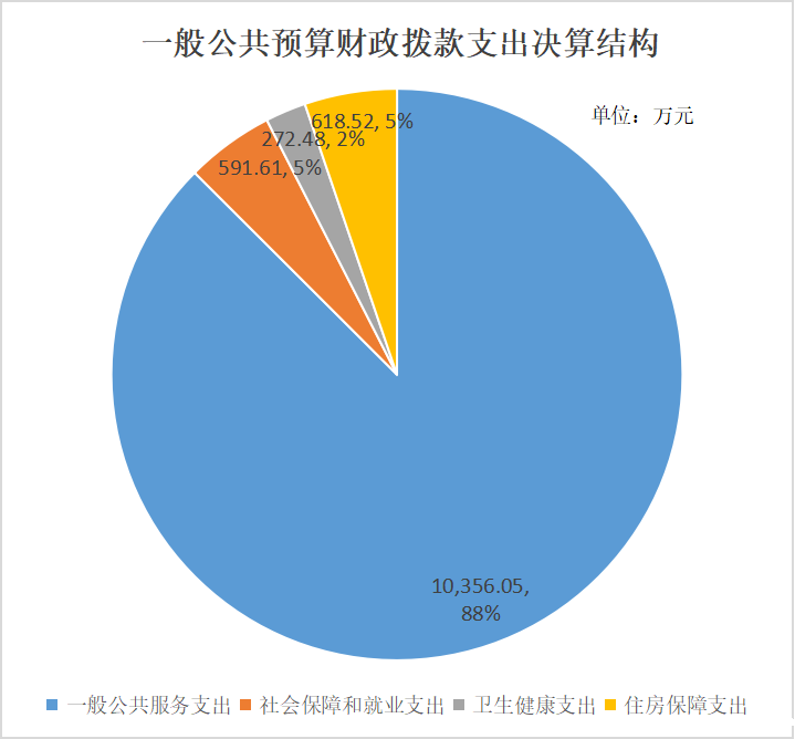 2022年一般公共预算财政拨款支出11,838.67万元,主要用于以下方面:一般公共服务支出10,356.05万元,占87.5%;社会保障和就业支出591.61万元,占5%;卫生健康支出272.48万元,占2.3%;住房保障支出618.52万元,占5.2%。