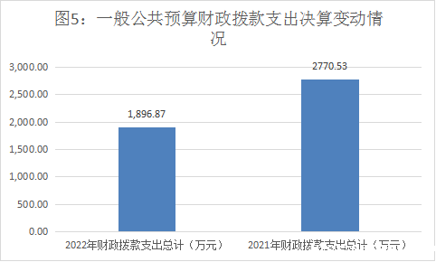五、一般公共预算财政拨款支出决算情况说明 (一)一般公共预算财政拨款支出决算总体情况。 2022年一般公共预算财政拨款支出1,896.87万元,占本年支出合计的61.6%。与2021年一般公共预算财政拨款支出2770.53万元相比,减少873.66万元,下降32%。主要变动原因是2022年财物改革后,经费保障由市、区财政共同保障,区财政保障经费由区财政代列财政拨款,在本决算报表中区财政保障的财政拨款数额反映在其他收入科目,故该决算报表财政拨款本年收入支出数均减少。