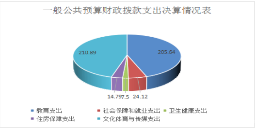 2022年一般公共预算财政拨款支出462.95万元,主要用于以下方面: 教育支出205.64万元,占44.4%;文化体育与传媒支出210.89万元,占45.6%;社会保障和就业支出24.12万元,占5.2%;卫生健康支出7.50万元,占1.6%;住房保障支出14.79万元,占3.2%。