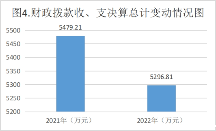 四、财政拨款收入支出决算总体情况说明 2022年度财政拨款收、支总计5,296.81万元。与2021年相比,财政拨款收、支总计各减少182.4万元,下降3.3%。收入增减变动原因包含三个方面:一是2022年年初结转结余比2021年年初结转结余减少763.05万元;二是一般公共预算财政拨款收入比2021年增加517.55万元;三是政府性基金预算财政拨款收入比2021年增加63.1万元。支出增减变动原因包含两个方面:一是2022年基本支出比2021年增加582.28万元;二是2022年项目支出比2021年减少764.68万元。