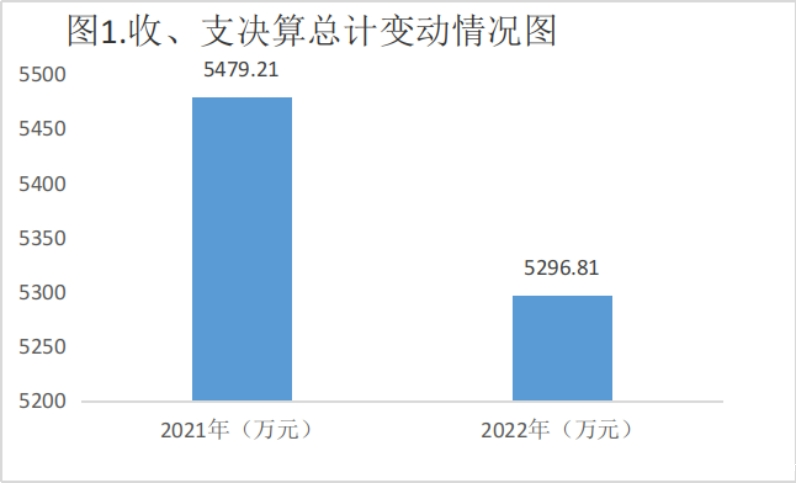 第二部分 2022年度部门决算情况说明一、收入支出决算总体情况说明 2022年度收、支总计5,296.81万元。与2021年相比,收、支总计各减少182.4万元,下降3.3%。收入增减变动原因包含三个方面:一是2022年年初结转结余比2021年年初结转结余减少763.05万元;二是一般公共预算财政拨款收入比2021年增加517.55万元;三是政府性基金预算财政拨款收入比2021年增加63.1万元。支出增减变动原因包含两个方面:一是2022年基本支出比2021年增加582.28万元;二是2022年项目支出比2021年减少764.68万元。