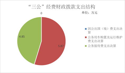 (图6:一般公共预算财政拨款支出决算结构)(饼状图) 2023年度一般公共预算支出决算数为921.46,完成预算100%。其中: 1.一般公共服务(类)统战事务(款)行政运行(项): 支出决算为620.29万元,完成预算100%,决算数等于预算数。 2.一般公共服务(类)统战事务(款)一般行政管理事务(项): 支出决算为82.35万元,完成预算100%,决算数等于预算数。 3.一般公共服务(类)统战事务(款)宗教事务(项): 支出决算为17万元,完成预算100%,决算数等于预算数。 4.一般公共服务(类)统战事务(款)华侨事务(项): 支出决算为7.79万元,完成预算100%,决算数等于预算数。 5.一般公共服务(类)统战事务(款)其他统战事务支出(项): 支出决算为14.99万元,完成预算100%,决算数等于预算数。 6.社会保障和就业(类)行政事业单位养老支出(款)机关事业单位基本养老保险缴费支出(项): 支出决算为61.75万元,完成预算100%,决算数等于预算数。 7.社会保障和就业(类)行政事业单位养老支出(款)机关事业单位职业年金缴费支出(项): 支出决算为30.01万元,完成预算100%,决算数等于预算数。 8.社会保障和就业(类)其他社会保障和就业支出(款)其他社会保障和就业支出(项): 支出决算为0.75万元,完成预算100%,决算数等于预算数。 9.卫生健康(类)行政事业单位医疗(款)行政单位医疗(项):支出决算为31.06万元,完成预算100%,决算数等于预算数。 10.住房保障支出(类)住房改革支出(款)住房公积金(项)支出决算55.46万元,完成预算100%,决算数等于预算数。 2023年度一般公共预算财政拨款基本支出799.33万元,其中: 人员经费671.38万元,主要包括:基本工资、津贴补贴、奖金、机关事业单位基本养老保险缴费、职业年金缴费、基本医疗保险缴费、其他社会保障缴费、其他工资福利支出、退休费、住房公积金。 2023年度“三公”经费财政拨款支出决算为10.72万元,完成预算82.46%,较上年度增加2.94万元,增长37.79%。决算数小于预算数的主要原因是厉行节俭,控制支出。 2023年度“三公”经费财政拨款支出决算中,因公出国(境)费支出决算0万元,占0%;公务用车购置及运行维护费支出决算5.87万元,占54.76%;公务接待费支出决算4.85万元,占45.24%。具体情况如下: (图7:“三公”经费财政拨款支出结构)(饼状图) 1.因公出国(境)经费支出0万元,完成预算0%。全年安排因公出国(境)团组0次,出国(境)0人。因公出国(境)支出决算与2022年持平。 2.公务用车购置及运行维护费支出5.87万元,完成预算97.83%。公务用车购置及运行维护费支出决算比2022年度增加0.46万元,增长8.55%。主要原因是公车油费支出增加。 其中:公务用车购置支出0万元。全年按规定更新购置公务用车0辆。截至2023年12月31日,单位共有公务用车2辆,其中:轿车1辆、越野车1辆。 公务用车运行维护费支出5.87万元。主要用于统战事务、侨台事务和民族宗教工作等所需的公务用车燃料费、维修费、过路过桥费、保险费等支出。 3.公务接待费支出4.85万元,完成预算69.28%。公务接待费支出决算比2022年度增加2.47万元,增长103.78%。主要原因是2023年疫情放开,接待上级部门和市外相关部门批次和人数增加,导致公务接待费增加。其中: 国内公务接待支出4.85万元,主要用于接待上级主管部门和各同级市、州统战相关部门餐费。国内公务接待23批次,415人次(不包括陪同人员),共计支出4.85万元,接待上级主管部门11批次来眉检查、调研、考察等支出2.65万元,接待其他市州统战系统12批次来眉调研、考察支出2.2万元。 2023年度政府性基金预算财政拨款支出0万元。 2023年度国有资本经营预算财政拨款支出0万元。 2023年度,中共雷竞技raybet官网入口最委统一战线工作部机关运行经费支出127.95万元,比2022年度增加29.95万元,增长30.56%。主要原因是2023年疫情放开,干部职工外出培训会议考察增加,导致机关运行经费增加。 2023年度,中共雷竞技raybet官网入口最委统一战线工作部政府采购支出总额4.47万元,其中:政府采购货物支出2.7万元、政府采购工程支出0万元、政府采购服务支出1.77万元。主要用于公务用车购燃油、维修保养和购买保险支出。授予中小企业合同金额1.25万元,占政府采购支出总额的27.96%,其中:授予小微企业合同金额0万元,占政府采购支出总额的0%。 截至2023年12月31日,中共雷竞技raybet官网入口最委统一战线工作部共有车辆2辆,其中:主要领导干部用车0辆、机要通信用车0辆、应急保障用车0辆、其他用车2辆,其他用车主要是用于保障部机关行政运行、调研考察接待等出行。单价100万元以上设备(不含车辆)0台(套)。 根据预算绩效管理要求,本部门在2023年度预算编制阶段,组织对民族宗教工作经费、统战工作经费、侨务工作经费等5个项目开展了预算事前绩效评估,对5个项目编制了绩效目标,预算执行结束后,选取5个项目开展绩效自评。预算执行过程中,选取5个项目开展绩效监控。 组织对2023年度一般公共预算、政府性基金预算全面开展绩效自评,形成中共雷竞技raybet官网入口最委统战部2023年整体绩效评价报告,其中,中共雷竞技raybet官网入口最委统战部2023年整体绩效评价报告绩效自评得分为95分,绩效自评报告详见第四部分附件。 第三部分 名词解释2.一般公共服务(类)统战事务(款)行政运行(项): 反映行政单位(包括实行公务员管理的事业单位)的基本支出。 3.一般公共服务(类)统战事务(款)一般行政管理事务(项): 反映行政单位(包括实