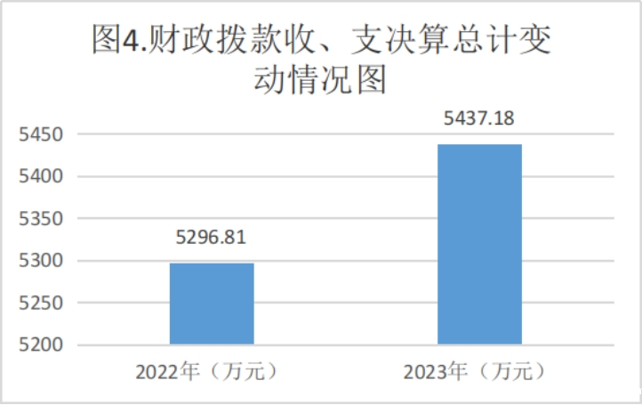 四、财政拨款收入支出决算总体情况说明 2023年度财政拨款收、支总计均为5437.18万元。与2022年度相比,财政拨款收、支总计各增加140.37万元,增长2.65%。收入增减变动原因:一是一般公共预算财政拨款收入比2022年增加450.56万元;二是政府性基金预算财政拨款收入比2022年减少310.19万元。支出增减变动原因:一是2023年基本支出比2022年增加56.57万元;二是2023年项目支出比2022年增加83.8万元。