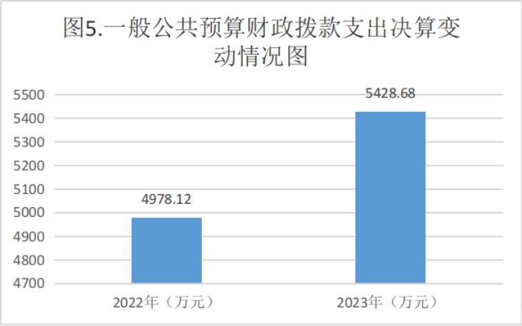 五、一般公共预算财政拨款支出决算情况说明 (一)一般公共预算财政拨款支出决算总体情况 2023年度一般公共预算财政拨款支出5428.68万元,占本年支出合计的99.84%。与2022年度相比,一般公共预算财政拨款支出增加450.56万元,增长9.05%。主要变动原因一是2023年一般公共预算财政拨款基本支出比2022年增加56.57万元;二是2023年一般公共预算财政拨款项目支出比2022年增加393.99万元。