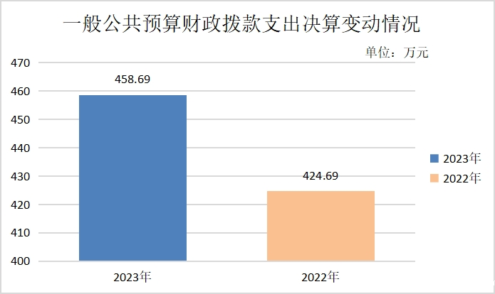 (图4:财政拨款收、支决算总计变动情况)(柱状图) 2023年度一般公共预算财政拨款支出458.69万元,占本年支出合计的100%。与2022年度相比,一般公共预算财政拨款支出增加34万元,增长8.01%。主要变动原因是增加退休人员一次性补贴、调资等人员经费支出。