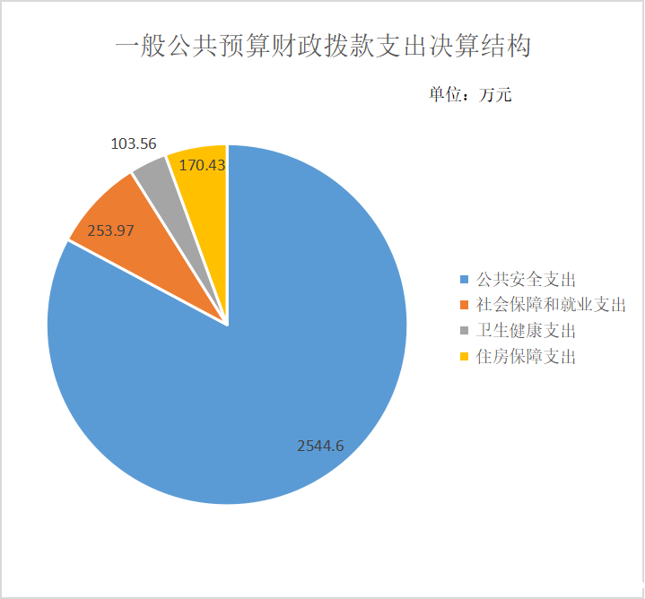 目录 公开时间:2024年9月25 日 目录 第一部分 部门概况一、部门职责预防、制止和侦查辖区内的违法犯罪活动;维护辖区内的社会治安秩序,制止危害社会治安秩序的行为;维护辖区内的交通安全和交通秩序;组织、实施辖区内的消防监督工作;管理辖区枪支弹药、管制刀具和易燃易爆剧毒、放射性等危险物品;对辖区法律、法规规定的特种行业进行管理;警卫国家规定的特定人员,守卫辖区内的重要场所和设施;管理辖区内的集会、游行、示威活动;对辖区内被判处管制、拘役、剥夺政治权利的罪犯执行刑罚,指导和监督辖区内的国家机关、社会团体、企业事业组织和重点建设工程的治安保卫工作,指导治安保卫委员会等群众性组织的治安防范工作;履行法律、法规规定的其他职责;完成市公安局和园区管委会交办的其他工作。 二、机构设置雷竞技raybet官网入口最公安局高新区分局下属二级预算单位1个,其中行政单位1个。 纳入雷竞技raybet官网入口最公安局高新区分局2023年度部门决算编制范围的二级预算单位包括: 1. 雷竞技raybet官网入口最公安局高新区分局 第二部分 2023年度部门决算情况说明一、 收入支出决算总体情况说明 2023年度收、支总计均为3,079.77万元。与2022年度相比,收、支总计各减少121.29万元,下降3.79%。主要变动原因是本年项目安排支出减少。 (图1:收、支决算总计变动情况图)(柱状图) 二、 收入决算情况说明 2023年度本年收入合计3,079.77万元,其中:一般公共预算财政拨款收入3072.55万元,占99.77%;政府性基金预算财政拨款收入7.22万元,占0.23%;国有资本经营预算财政拨款收入0万元,占0%;上级补助收入0万元,占0%;事业收入0万元,占0%;经营收入0万元,占0%;附属单位上缴收入0万元,占0%;其他收入0万元,占0%。 (图2:收入决算结构图)(饼状图) 三、 支出决算情况说明 2023年度本年支出合计3,079.77万元,其中:基本支出2,815.81万元,占91.43%;项目支出263.96万元,占8.57%;上缴上级支出0万元,占0%;经营支出0万元,占0%;对附属单位补助支出0万元,占0%。 (图3:支出决算结构图)(饼状图) 四、财政拨款收入支出决算总体情况说明 2023年度财政拨款收、支总计均为3,079.77万元。与2022年度相比,财政拨款收、支总计各减少121.29万元,下降3.79%。主要变动原因是本年项目安排支出减少。 (图4:财政拨款收、支决算总计变动情况)(柱状图) 五、一般公共预算财政拨款支出决算情况说明 (一)一般公共预算财政拨款支出决算总体情况 2023年度一般公共预算财政拨款支出3,072.55万元,占本年支出合计的99.77%。与2022年度相比,一般公共预算财政拨款支出减少23.67万元,下降0.76%。主要变动原因是本年项目安排支出减少。 (图5:一般公共预算财政拨款支出决算变动情况)(柱状图) (二)一般公共预算财政拨款支出决算结构情况 2023年度一般公共预算财政拨款支出3,072.55万元,主要用于以下方面:公共安全支出*2544.6万元,占82.82%;社会保障和就业支出253.97万元,占8.27%;卫生健康支出103.56万元,占3.37%;住房保障支出170.43万元,占5.55%。 (图6:一般公共预算财政拨款支出决算结构)(饼状图) (三)一般公共预算财政拨款支出决算具体情况 2023年度一般公共预算支出决算数为3,072.55万元,完成预算100%。其中: 1.公共安全支出(类)公安(款)行政运行(项): 支出决算为2,287.85万元,完成预算100%,决算数等于预算数。 2.公共安全支出(类)公安(款)一般行政管理事务(项): 支出决算为29.39万元,完成预算100%,决算数等于预算数。 3.公共安全支出(类)公安(款)执法办案(项): 支出决算为135.14万元,完成预算100%,决算数等于预算数。 4.公共安全支出(类)公安(款)其他公安支出(项): 支出决算为78.00万元,完成预算100%,决算数等于预算数。 5.公共安全支出(类)其他公共安全支出(款)其他公共安全支出(项): 支出决算为14.22万元,完成预算100%,决算数等于预算数。 6.社会保障和就业支出(类)行政事业单位养老支出(款)机关事业单位基本养老保险缴费支出(项):支出决算为188.34万元,完成预算100%,决算数等于预算数。 7.社会保障和就业支出(类)行政事业单位养老支出(款)机关事业单位职业年金缴费支出(项):支出决算为61.82万元,完成预算100%,决算数等于预算数。 8.社会保障和就业支出(类)其他社会保障和就业支出(款)其他社会保障和就业支出(项):支出决算为3.81万元,完成预算100%,决算数等于预算数。 9.卫生健康支出(类)行政事业单位医疗(款)行政单位医疗(项):支出决算为103.56万元,完成预算100%,决算数等于预算数。 10.住房保障支出(类)住房改革支出(款)住房公积金(项):支出决算为170.43万元,完成预算100%,决算数等于预算数。 六、一般公共预算财政拨款基本支出决算情况说明 2023年度一般公共预算财政拨款基本支出2,815.81万元,其中: 人员经费2,224.56万元,主要包括:基本工资、津贴补贴、奖金、机关事业单位基本养老保险缴费、职业年金缴费、其他社会保障缴费、其他工资福利支出、退休费等。 七、财政拨款“三公”经费支出决算情况说明 (一)“三公”经费财政拨款支出决算总体情况说明 2023年度“三公”经费财政拨款支出决算为40.86万元,完成预算93.89%,较上年度增加0.09万元,增长0.21%。决算数小于预算数的主要原因是坚持厉行节约。 (二)“三公”经费财政拨款支出决算具体情况说明 2023年度“三公”经费财政拨款支出决算中,因公出国(境)费支出决算0万元,占0%;公