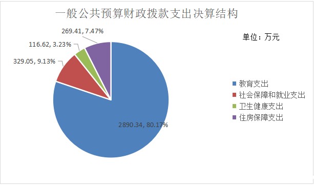 2023年度一般公共预算财政拨款支出3605.42万元,主要用于以下方面:教育支出2890.34万元,占80.17%;社会保障和就业支出329.05万元,占9.13%;卫生健康支出116.62万元,占3.23%;住房保障支出269.41万元,占7.47%。